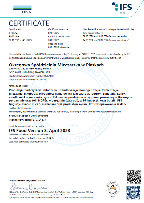 Jak co roku, po udanym audycie przeprowadzonym w grudniu, uzyskaliśmy certyfikat IFS Food. Certyfikat ten koncentruje się na zapewnieniu bezpieczeństwa oraz wysokiej jakości produktów spożywczych na każdym etapie procesu produkcji.